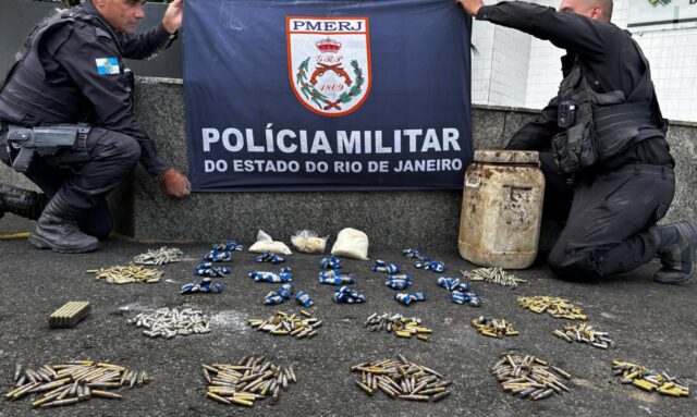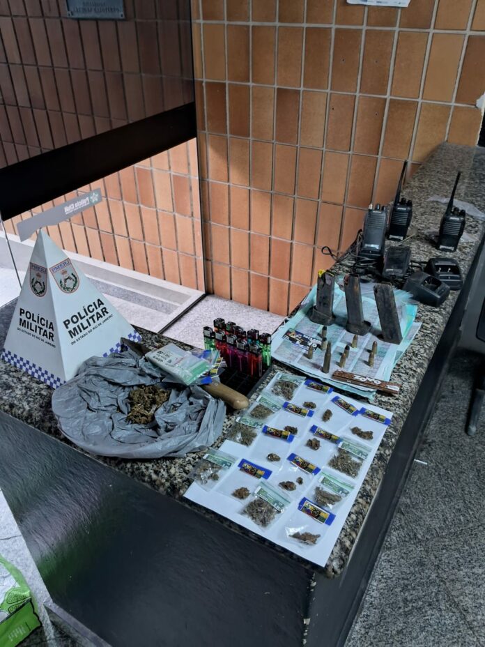 Foram apreendidos quatro rádios comunicadores, três bases de carregadores, três carregadores de pistola, oito munições calibre 9mm, uma munição de fuzil calibre 7.62, além de 16 sacolés de maconha e aproximadamente 200 gramas da mesma droga. Também foram recolhidos materiais para endolação, uma faca e dez isqueiros.