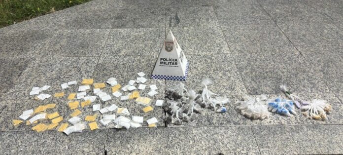 De acordo com a PM, a equipe recebeu informações e seguiu até o local, onde, durante patrulhamento, avistou um suspeito em atitude considerada suspeita. Ao perceber a aproximação da viatura, o indivíduo fugiu e não foi localizado. Em seguida, os policiais realizaram buscas na área e encontraram uma sacola contendo 97 papelotes de cocaína, 48 pinos da mesma substância, 40 buchas de maconha e 31 pedras de crack.