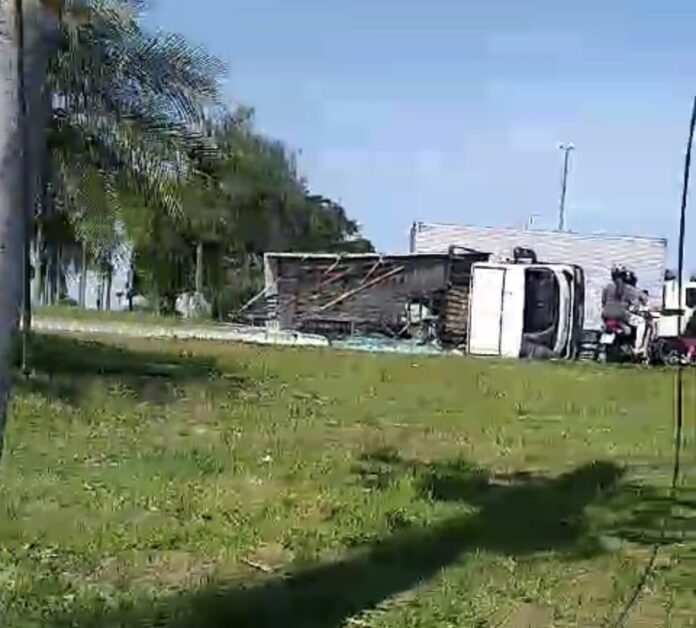 Na tarde desta terça-feira (5) três homens ficaram feridos após um acidente envolvendo um caminhão na BR-101, na altura do Parque Rodoviário, em Campos. O veículo transportava uma carga de vidro, parte da qual se quebrou durante o incidente.