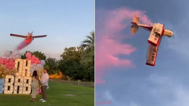 Um vídeo publicado nas redes sociais mostra o momento em que o piloto sobrevoa a festa e solta um pó rosa, indicando que o casal terá uma menina.