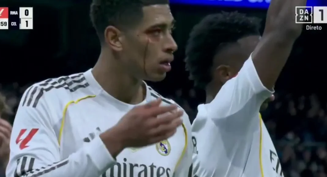 Bellingham sangra após cotovelada e leva cartão ao voltar sem autorização