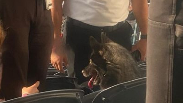 Na fotografia, é possível ver dois homens, aparentemente membros da segurança, que deram conta da presença da cadela e ficaram a vigiando até a retirarem para um local seguro.