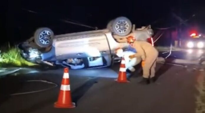 Um carro capotou após derrubar um poste na Rodovia Retiro Barra, nas proximidades do Destacamento de Polícia Ostensiva (DPO) de Santa Clara, em São Francisco de Itabapoana (SFI), na noite do último sábado (06).
