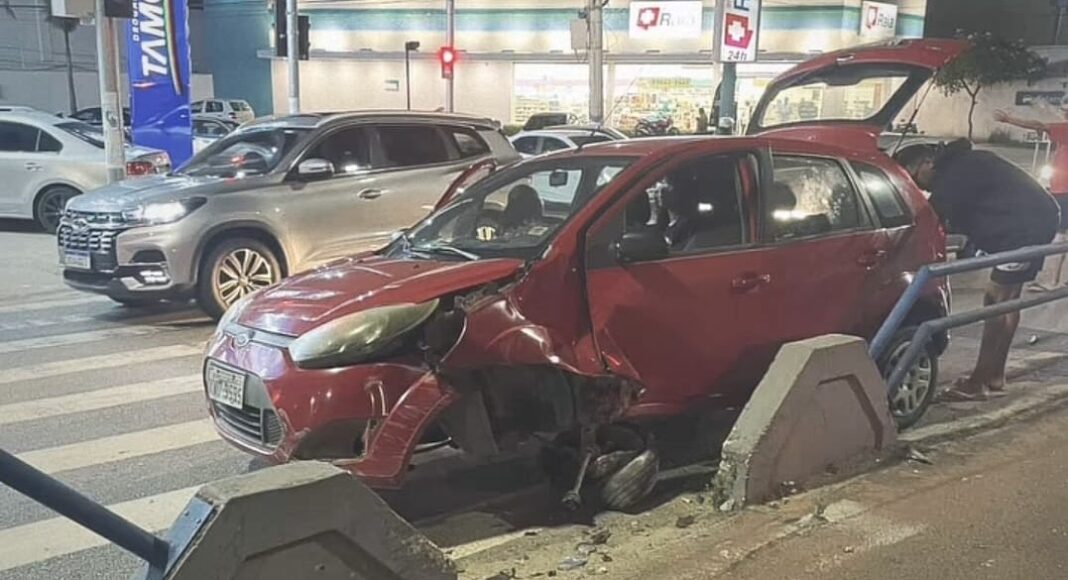 Um carro ficou parcialmente destruído após colidir contra a mureta de proteção da ciclovia na Avenida 28 de Março, em Campos, na noite desta terça-feira (11). Pelo menos uma pessoa ficou ferida no acidente.