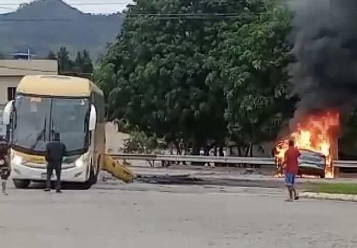 Na manhã deste domingo (30), um carro pegou fogo depois de bater em um ônibus na Rodovia Governador Mario Covas, na altura do km 400, na BR-101, em Campos. Uma pessoa pessoa ainda não identificada ficou ferida.