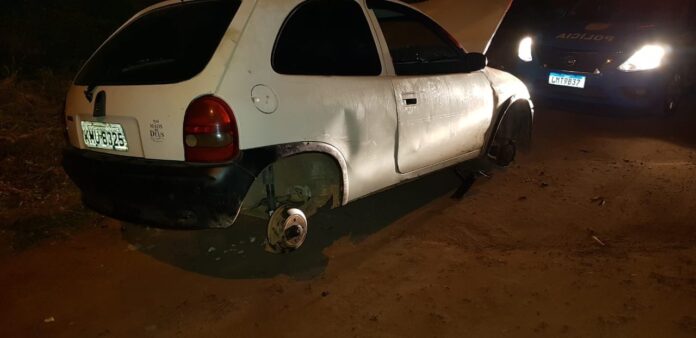 Os policiais foram acionados para verificar a denúncia de um veículo abandonado que seria produto de roubo. Ao chegar no local foi verificado que o automóvel estava sem as 4 rodas, sem o banco dianteiro do carona, sem bateria, sem o forró das laterais da porta do motorista e do carona, sem estepe e a chave de rodas. Ao verificar a numeração do chassi, não batia com a placa.