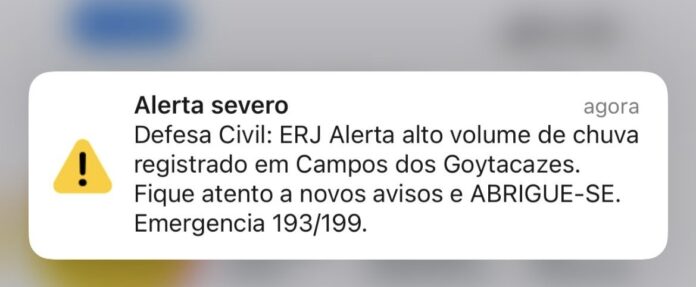 A Secretaria Municipal de Defesa Civil de Campos esclareceu que o alerta de fortes chuvas recebido pela população nesta terça-feira (24) foi emitido pelo Centro Estadual de Monitoramento e Alerta de Desastres Naturais (Cemaden-RJ), no âmbito do sistema estadual, e não pelo Centro de Monitoramento de Desastres de Campos.