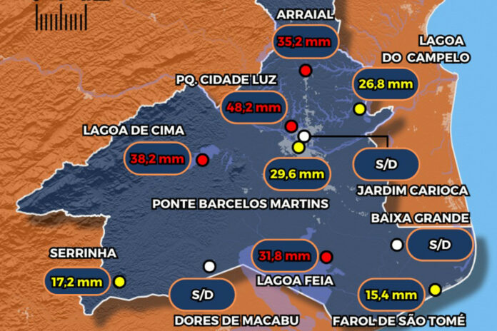 Outros pontos também apresentaram índices consideráveis, segundo a Defesa Civil, como a medição feita na Ponte Barcelos Martins (29,6 mm), Lagoa do Campelo (26,8 mm), Morro do Coco (22,6 mm), Serrinha (17,2 mm) e Farol de São Tomé (15,4 mm).