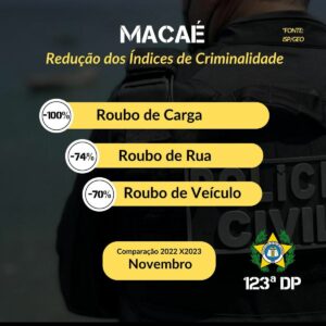 Em novembro de 2023, a 123ª Delegacia de Polícia de Macaé registrou uma nova queda histórica nos índices de criminalidade. De acordo com o Instituto de Segurança Pública (ISP/GEO), houve uma redução significativa nos indicadores criminais em comparação ao mesmo período do ano anterior.