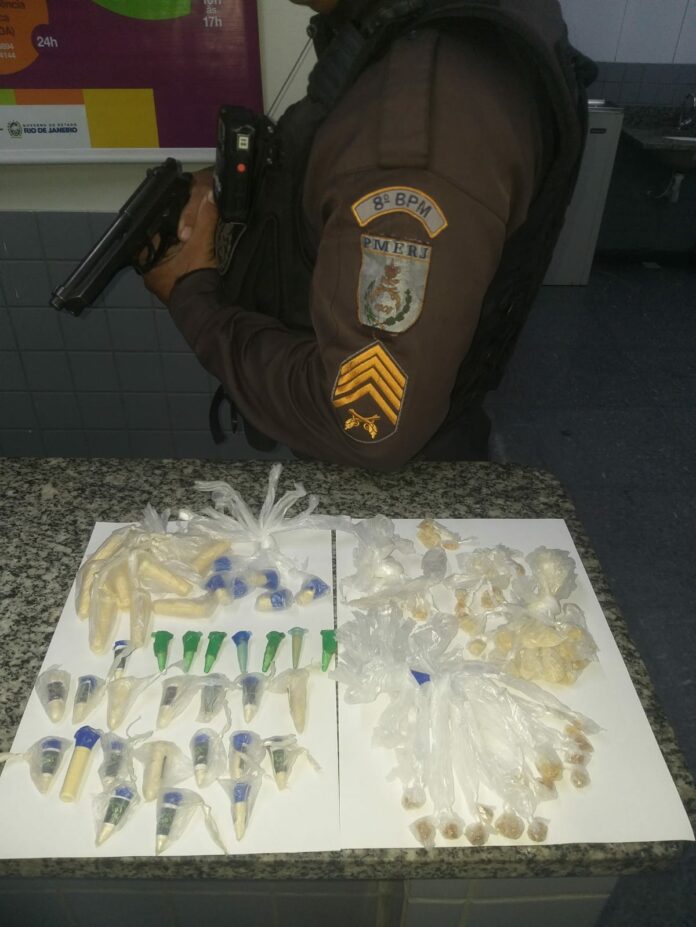 Durante patrulhamento por um local onde havia homens na prática do tráfico de drogas, os agentes realizaram uma busca minuciosa e conseguiram encontrar 40 pinos de cocaína e 45 pedras de crack.
