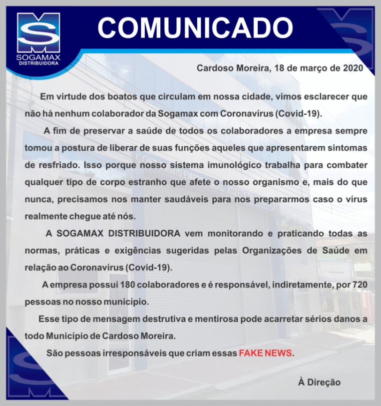 A empresa precisou divulgar uma nota negando que tenha algum trabalhador atuando com sintomas do coronavírus, e alertando que a informação não prejudica apenas a empresa, mas sim todo o município de Cardoso Moreira. “Esse tipo de mensagem destrutiva e mentirosa pode acarretar sérios danos a todo município de Cardoso Moreira. São pessoas irresponsáveis que criam essas fake news”.