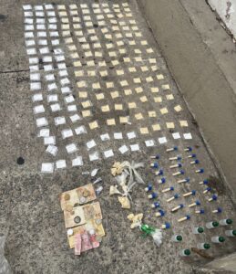 Em diligências paralelas, parte da guarnição localizou, em outro ponto, grande quantidade de material entorpecente e objetos relacionados ao tráfico de drogas. Ao todo, foram apreendidos 178 sacolés de cocaína, totalizando aproximadamente 890 gramas; 31 pinos da mesma substância, com cerca de 155 gramas; oito frascos de substância conhecida como “loló”; R$ 195 em dinheiro e um aparelho celular da marca Apple, modelo iPhone.