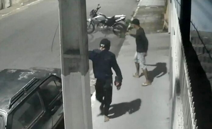 O crime aconteceu por volta das 3h, em frente a uma residência. Imagens de câmeras de segurança registraram o momento em que os suspeitos chegam ao local, danificam a direção de uma Honda Falcon prata e, em seguida, fogem levando o veículo.