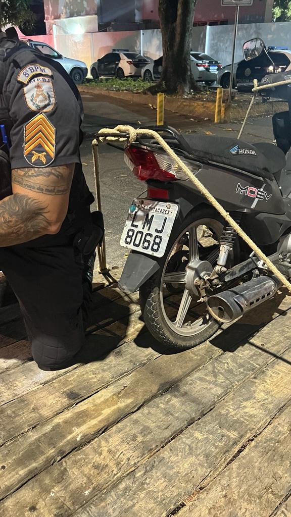 Oa agentes foram acionadas para verificar o roubo de motocicleta. Ao chegar no local, os policiais se depararam com um homem detido por populares junto a motocicleta de cor cinza que havia sido subtraída da vítima.