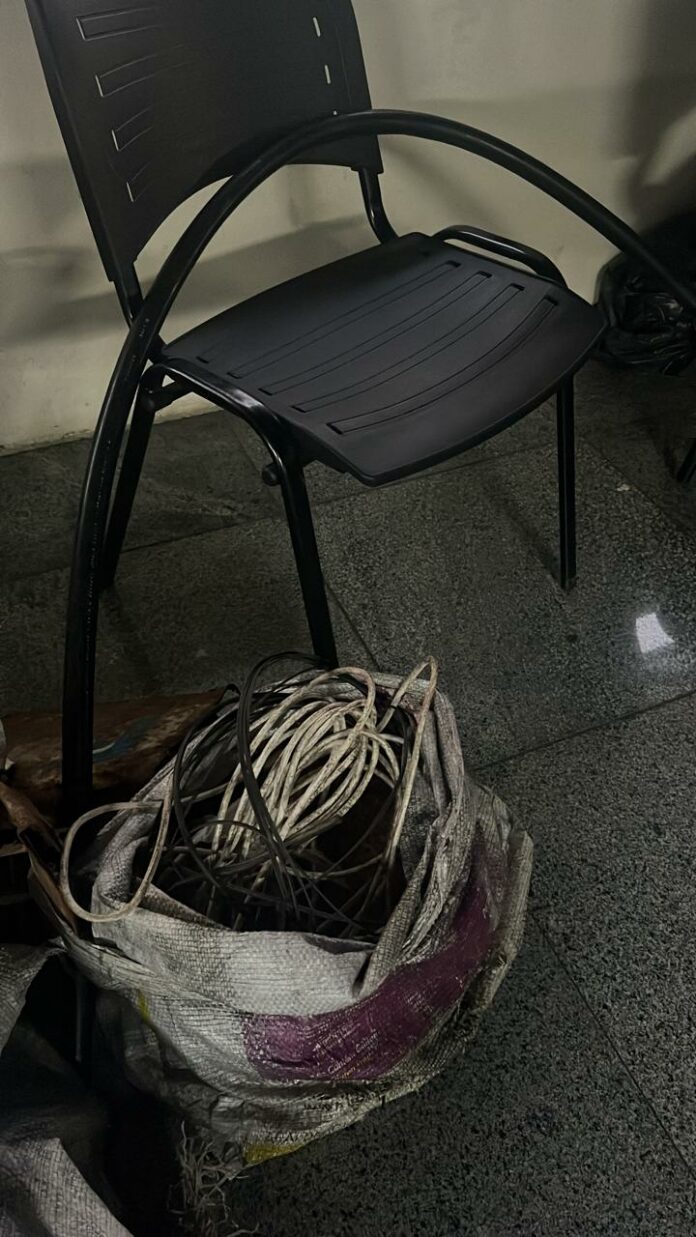 Os policiais foram acionados para verificar informações sobre indivíduos envolvidos em atividades suspeitas de furto de fios. Ao chegarem ao local, os agentes identificaram dois homens com fios cortados e espalhados, além de um saco de nylon contendo fios.