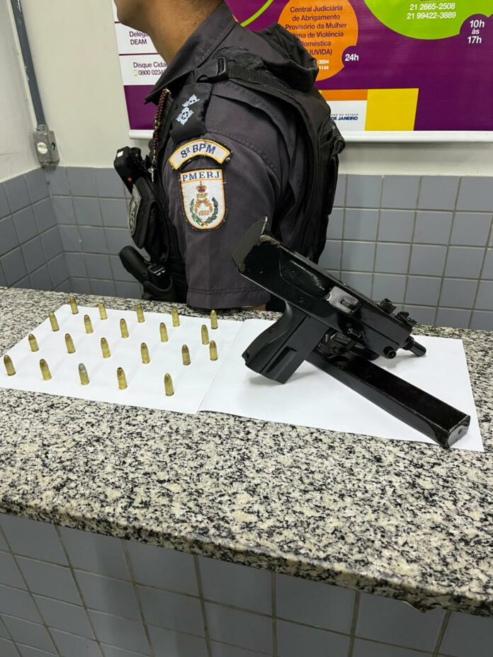 Uma abordagem foi realizada e após buscas, os policiais apreenderam uma submetralhadora com numeração ilegível com um carregador contendo 21 munições intactas.