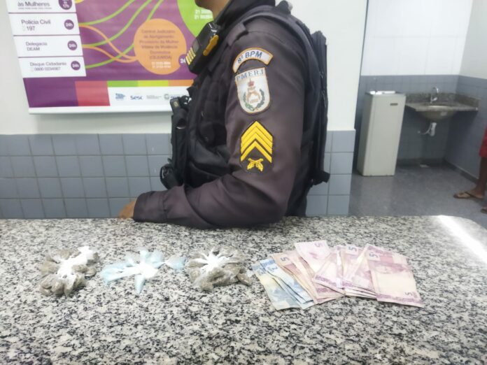 O suspeito foi abordado e após buscas, os policiais conseguiram recuperar a sacola que continha 48 buchas de maconha, 10 pinos de cocaína e R$ 103.