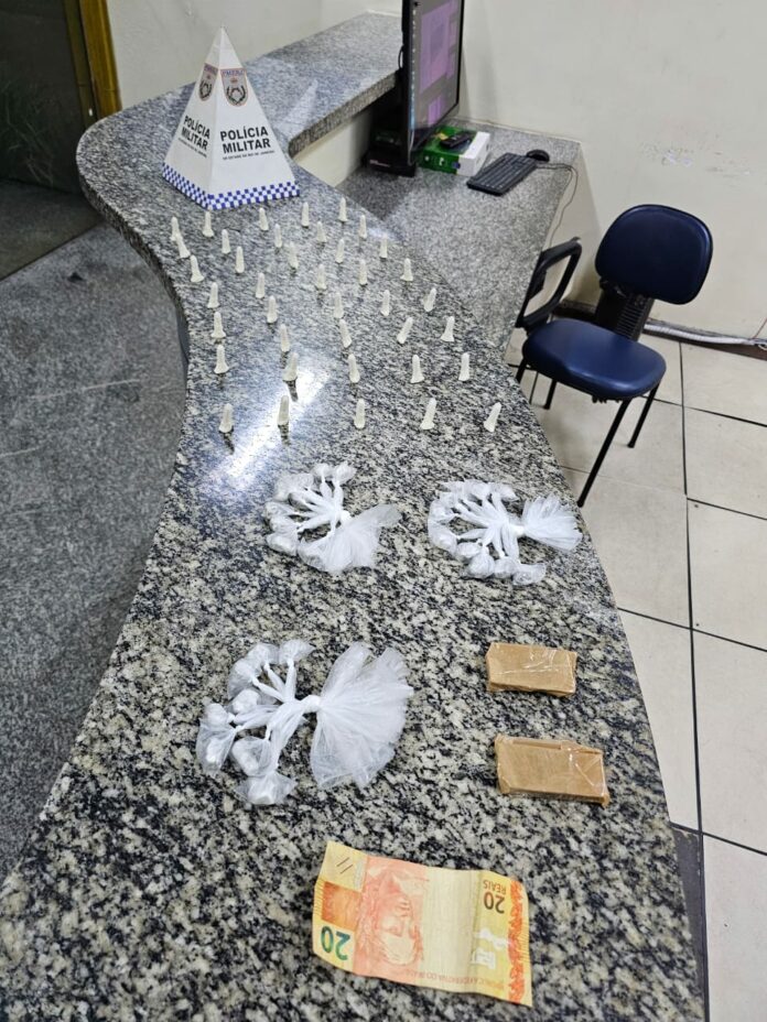 De acordo com a polícia, dois homens foram abordados em atitude suspeita. Durante a revista, os agentes apreenderam 39 pinos de cocaína, 28 sacolés de maconha, duas porções da mesma substância do tipo “mariola” e R$ 20 em dinheiro. Um dos suspeitos foi conduzido à delegacia, onde foi autuado por envolvimento com o tráfico de entorpecentes.
