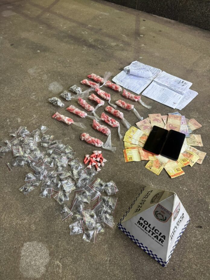 A guarnição realizava patrulhamento quando recebeu informação anônima de que o suspeito chegaria ao ponto de venda em uma motocicleta vermelha. Foi montado cerco tático e, no momento da abordagem, “Julianão” teria repassado um pino de cocaína a um usuário por intermédio de outro indivíduo. Após tentativa de fuga, o suspeito foi capturado e confessou o crime, indicando o local onde armazenava o material. No imóvel, foram apreendidos 234 pinos de cocaína, 99 porções de maconha, dois celulares e R$ 428,00 em espécie.