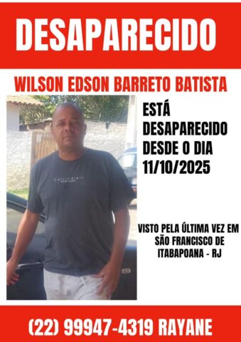 A Polícia Civil investiga o desaparecimento de Wilson Edson Barreto Batista, morador de Atafona, distrito de São João da Barra, que foi levado à força por três homens encapuzados, na noite em que estava hospedado em uma casa no município de São Francisco de Itabapoana.