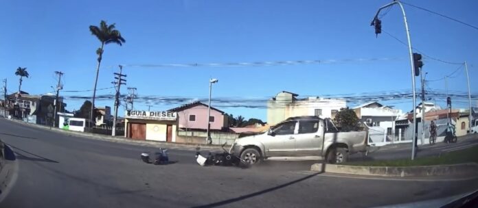 Imagens registradas por câmeras em um carro mostram o momento em que a caminhonete atinge a scooter por trás, próximo a um semáforo. Com o impacto, os ocupantes foram arremessados e caíram na pista.