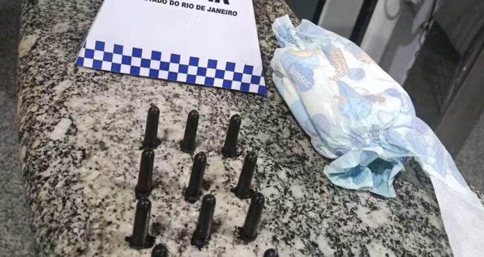 Segundo a PM, com a suspeita foram encontradas 11 porções de cocaína escondidas dentro de uma bolsa, armazenadas no interior de uma fralda descartável.