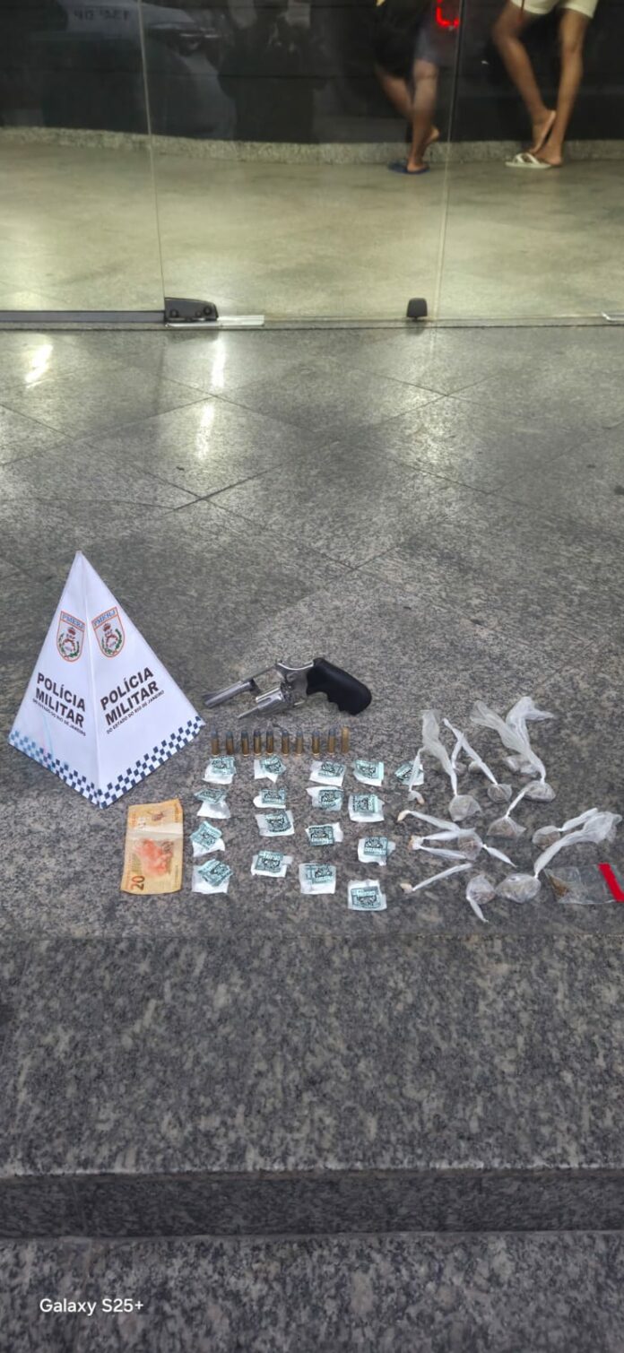Segundo a PM, a equipe foi acionada por volta das 5h e, ao retornar de uma ocorrência, avistou indivíduos ligados ao tráfico na região, realizando a abordagem. Durante a ação, o suspeito identificado como K.G.O., de 19 anos, tentou se desfazer de uma bolsa, onde foram encontrados 17 invólucros de cocaína, 5 pedras de crack, 12 porções de maconha e munições calibre .38. Ainda no local, os policiais apreenderam um revólver calibre .38, municiado, que estava próximo ao acusado e foi por ele assumido. Também foram apreendidos R$ 20 em espécie.