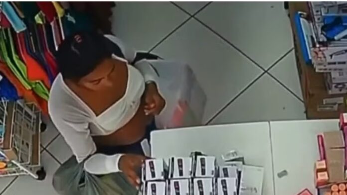 Imagens do circuito interno de segurança mostram uma mulher, vestindo uma blusa branca, furtando alguns produtos e colocando-os dentro de uma sacola.