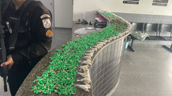 Os policiais continuaram adentrando na comunidade, onde foram encontrados 1.625 pinos de cocaína de vários tamanhos, 490 pedras de crack e 62 sacolés contendo maconha.