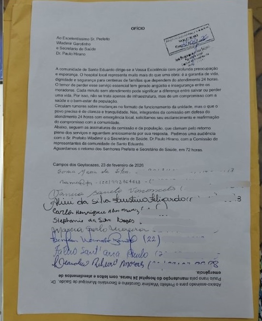 Cerca de 1.200 assinaturas foram reunidas por moradores de Santo Eduardo, no extremo Norte de Campos dos Goytacazes, em um abaixo-assinado protocolado na terça-feira (23). O documento solicita audiências com o prefeito Wladimir Garotinho e com o secretário municipal de Saúde, Paulo Hirano, para discutir a mudança no modelo de atendimento da unidade de saúde do distrito.