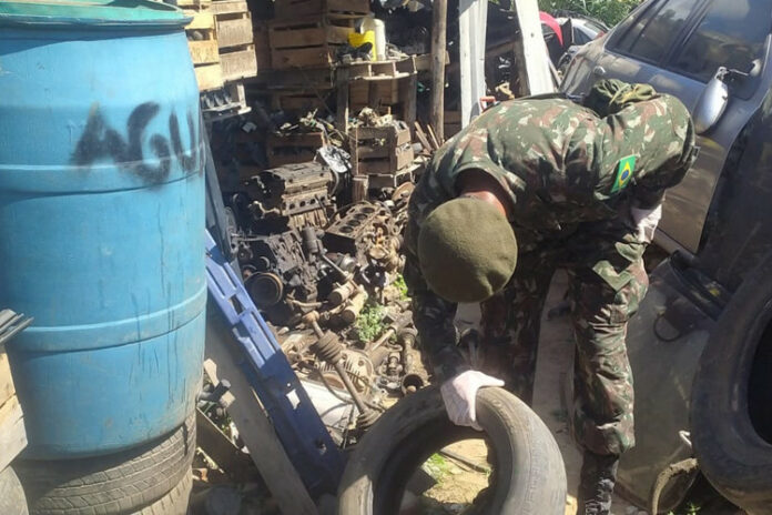 REFORÇO – A parceria com os soldados da 2ª Cia. de Infantaria do Exército segue trazendo resultados satisfatórios para o combate ao mosquito transmissor da dengue e seus vetores. Nos três dias de trabalho, os soldados visitaram 508 imóveis e trataram, com a ajuda dos agentes, 138 imóveis entre residências e pontos comerciais. Também vistoriaram 63 terrenos baldios nas localidades. Foram encontrados 41 focos e 18 pneus recolhidos.