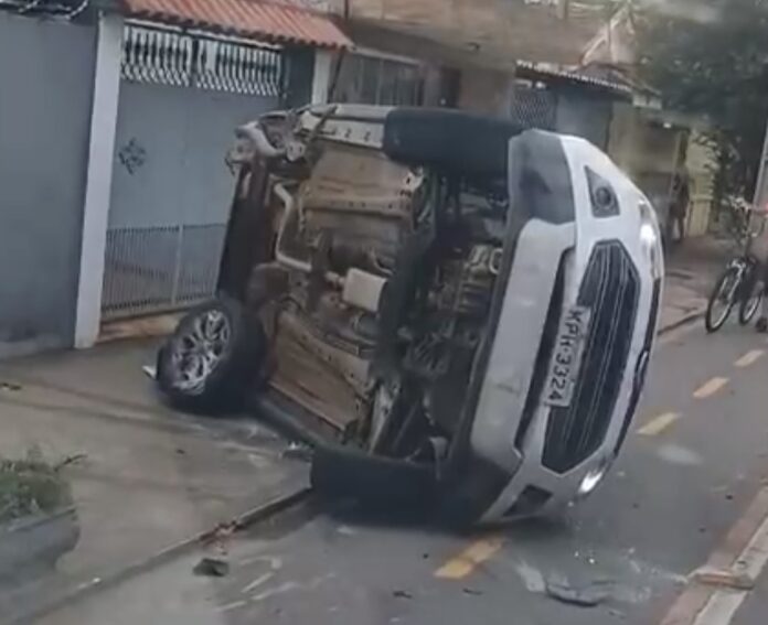 Com a força do impacto, o EcoSport chegou a capotar, chamando a atenção de moradores e motoristas que passavam pelo local no momento da batida.