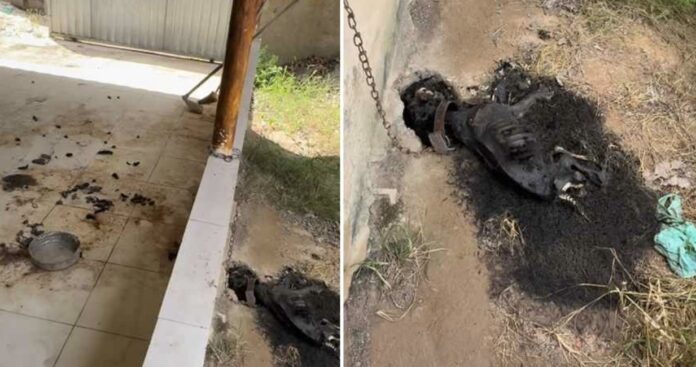 O cachorro estava acorrentado, ao lado de um recipiente vazio, sem acesso a água ou alimento. A equipe estima que o animal tenha morrido há cerca de uma semana.