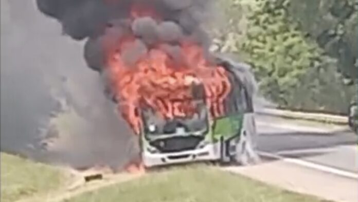 Ônibus pega fogo na BR-101 em Campos