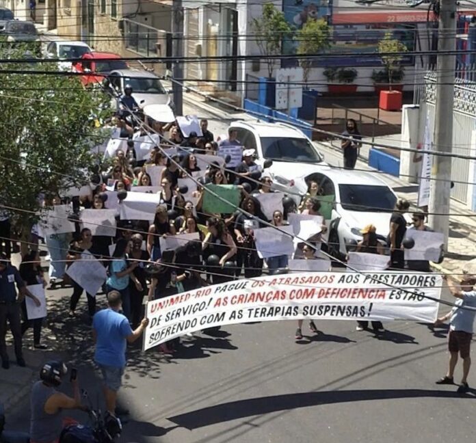 A manifestação teve início em frente à Central de Autorização da Unimed, localizada na Rua Barão de Miracema, e seguiu até a sede do Ministério Público do Rio de Janeiro (MPRJ). Os manifestantes exibiram cartazes com mensagens impactantes, como: “Unimed-Rio, pague os atrasados aos prestadores de serviço!”.