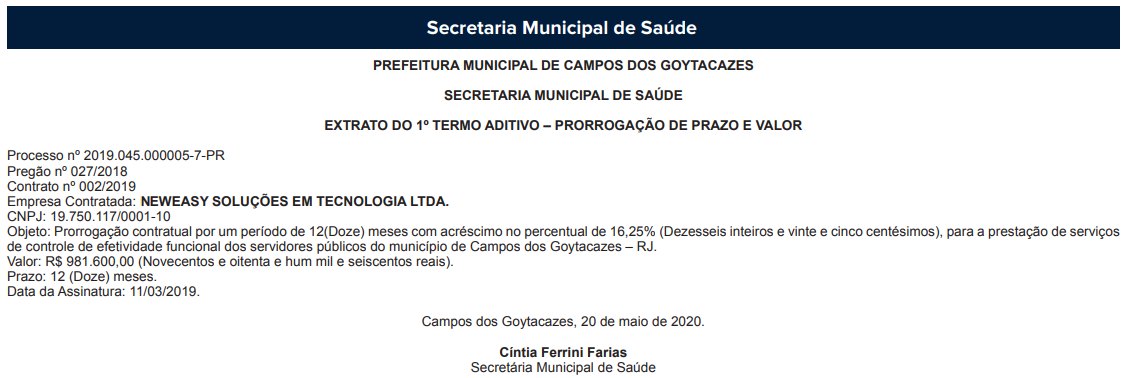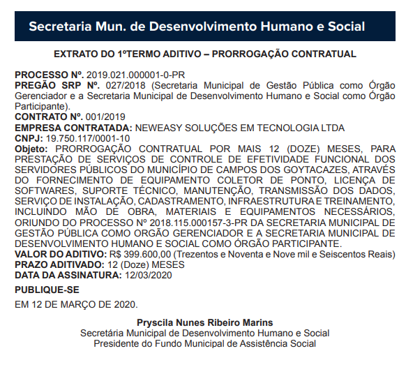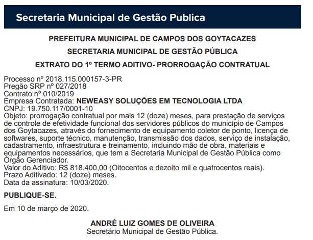 Talvez a medida seja para justificar os mais de R$ 4 milhões em aditivos publicados no Diário Oficial do dia 26 de maio, onde a prefeitura, através de quatro secretarias, assinou um aditivo de mais 12 meses com a empresa NEWEASY SOLUÇÕES EM TECNOLOGIA LTDA, responsável pelo serviço.
