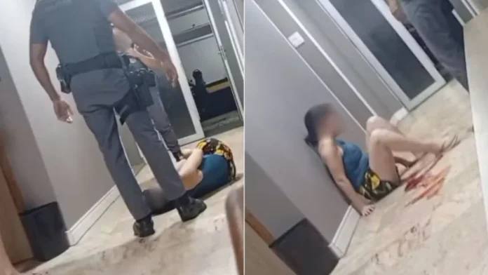 Um policial militar foi flagrado nesta quinta-feira, 19, chutando o rosto de uma mulher que aparentava estar em surto, no corredor de um prédio, em…