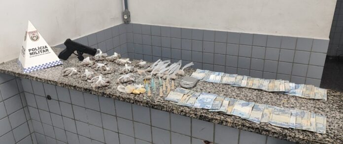 Segundo a ocorrência, o imóvel apresentava sinais de abandono e, durante revista, os agentes localizaram sobre uma cama coberta por uma colcha: 1 pedra de crack, 2 pedras de cocaína, 10 pinos de cocaína e 140 buchas de maconha. Também foram encontrados um simulacro de arma de fogo, uma balança de precisão e a quantia de R$ 104,00 em espécie.