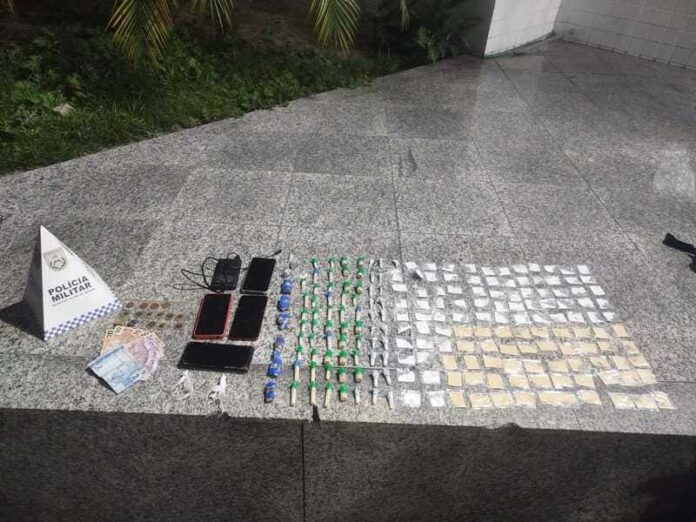 Além das drogas, os policiais apreenderam R$ 95,25 em dinheiro e diversos aparelhos celulares, alguns encontrados próximos ao local da abordagem. Outros três suspeitos também foram detidos, portando celulares e quantias em espécie. Com o segundo menor apreendido, nada de ilícito foi localizado.