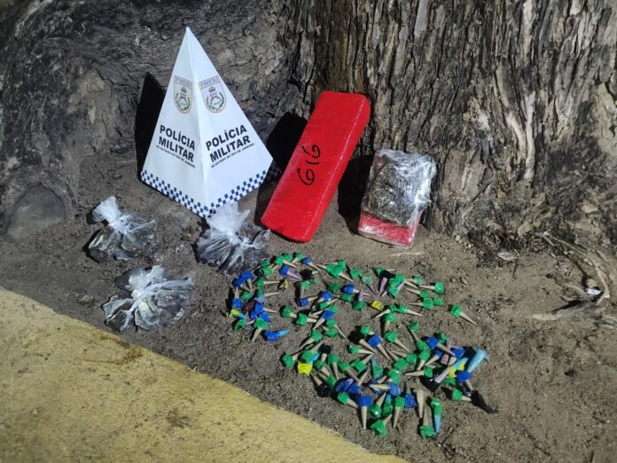 De acordo com a ocorrência, ao chegar ao local, os agentes observaram vários suspeitos que fugiram ao perceber a aproximação da viatura, não sendo possível alcançá-los. Durante buscas na região, os policiais localizaram um tonel enterrado contendo 2 tabletes de maconha, 115 pinos de cocaína e 38 buchas de maconha. Todo o material foi recolhido e levado para a delegacia.