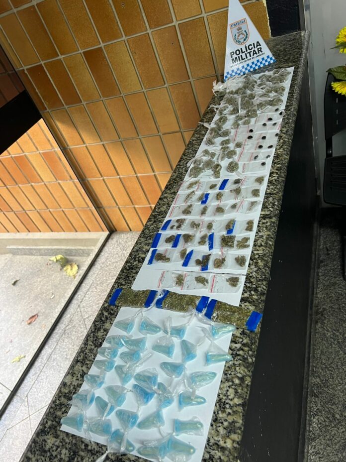 Durante a ação, os agentes observaram um suspeito entrando e saindo da região por diversas vezes. Ao tentar realizar a abordagem, o suspeito percebeu a aproximação policial e conseguiu fugir. Após buscas pelo local, os militares encontraram uma sacola contendo 64 buchas de maconha, 33 invólucros de skank, 31 pinos de cocaína e 15 invólucros de haxixe.