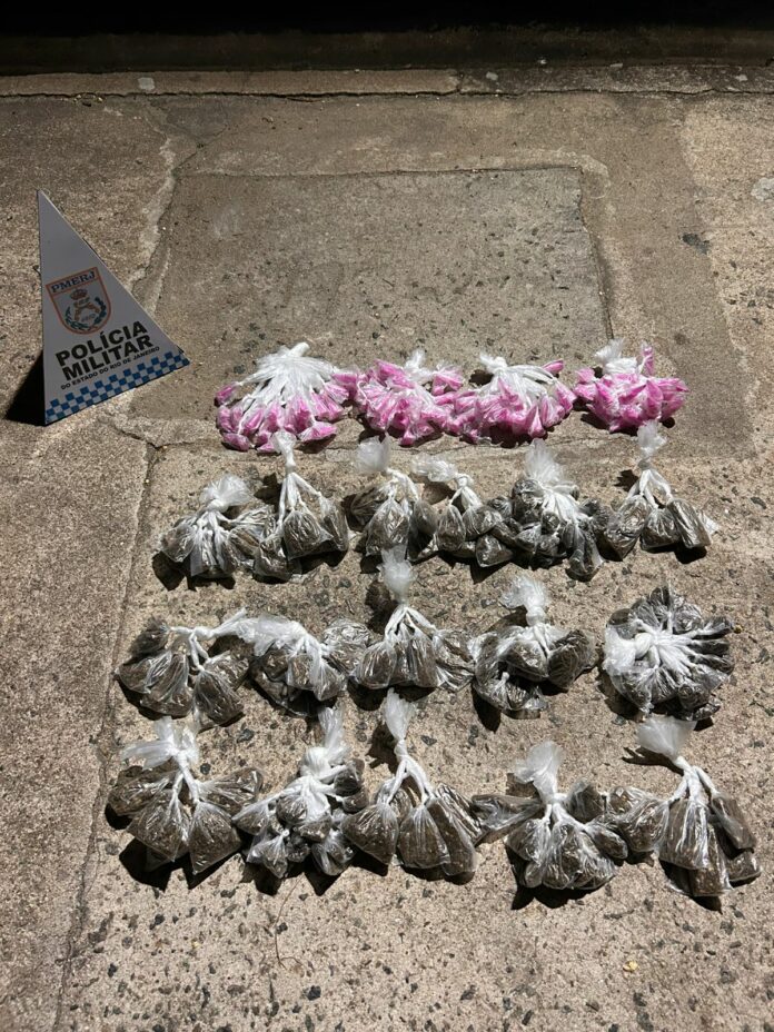 Segundo a polícia, após entrada estratégica no local, agentes abordaram homens no interior da comunidade conhecida como “Beco do São Lino”. Com eles nada ilícito foi encontrado, porém os policiais identificaram vestígios compatíveis com a prática de tráfico. Em um buraco de muro foram achados 3 pinos de pó branco aparentando cocaína. As buscas foram ampliadas até um terreno baldio próximo, onde foram arrecadadas 145 buchas de maconha escondidas sob paralelepípedos e 100 pinos de cocaína encontrados em uma sacola verde dentro de outro buraco.