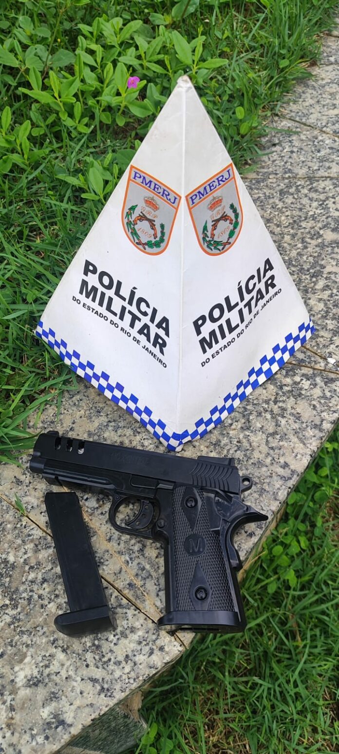 Segundo a PMERJ, os policiais seguiram imediatamente para o endereço informado e realizaram a abordagem dos suspeitos. Durante a revista, foi localizada, na cintura de um dos envolvidos, uma réplica de pistola. Diante do fato, o material foi recolhido e apresentado à autoridade policial.