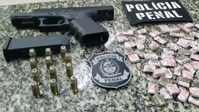 Foram apreendidas uma pistola calibre 40 mm com 12 munições intactas e 86 buchas de maconha que estavam escondidas em um tonel em uma área de área aberta.