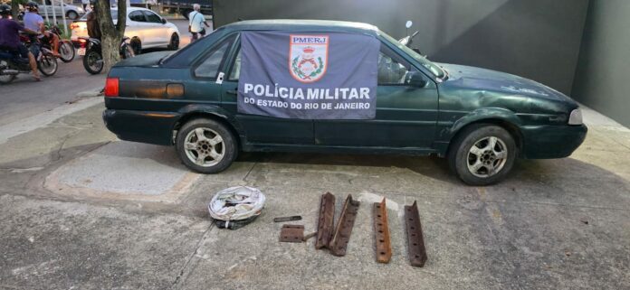 De acordo com informações do 6º CPA – 8º BPM – 4ª Cia, a guarnição retornava à OPM quando avistou um veículo Volkswagen Santana, de cor verde, parado no acostamento da rodovia. Nas proximidades, estavam dois homens, um ao lado do carro e outro próximo a um pasto, segurando um saco e entregando o conteúdo ao comparsa. Ao perceberem a presença policial, os suspeitos tentaram fugir, mas foram rapidamente alcançados e abordados. Durante a busca veicular, os agentes encontraram, na parte traseira do automóvel (sem o assento), um saco contendo materiais metálicos utilizados em linhas férreas.