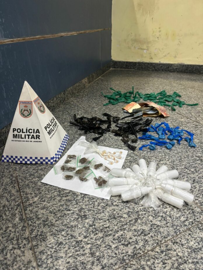 Com o suspeito, os policiais apreenderam uma variedade de drogas e dinheiro: 53 sacolés de cocaína, 33 buchas de maconha, 14 buchas de skank, 15 pedras de crack, 15 frascos de loló, além de R$ 181,25 em espécie e um aparelho celular.