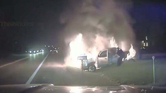 Um policial do Departamento de Fraser resgatou uma mulher de um veículo em chamas, no dia 16 de dezembro, para um local seguro numa estrada em Detroit, no Michigan, EUA.