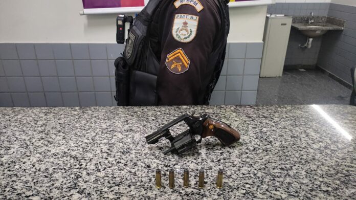 Durante a ação, os policiais apreenderam 1 revólver, 5 munições e uma bucha de maconha.