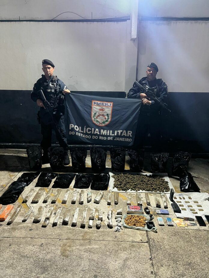 Segundo a Polícia Militar, durante a ação foram encontrados diversos itens distribuídos em sacolas e sobre uma mesa no interior da área alvo da operação. O material apreendido inclui 14 munições calibre 5.56, 50 munições calibre .45, 5,515 kg de maconha, 2 kg de cocaína, R$ 69,00 em espécie, dois celulares, uma base de carregamento de rádio, três balanças de precisão e dois carregadores de fuzil.